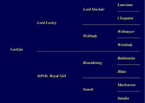 Aus Laetizia's Mutterstamm entspringen neben gekörten Hengsten bis zur Klasse S erfolgreiche Sportpferde. Ihre Mutter ist unsere Stute Royal Girl. Diese war dreijährig Siegerstute ihrer Stuteneintragung, wurde mit der Staatsprämie ausgezeichnet und war Endringstute der Elitestutenschau. Großmutter ist unsere Stute Sonett, die neben weiteren Erfolgen u.a. für das Bundeschampionat in Warendorf qualifiziert war.